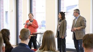 Ausstellungseröffnung mit HBZ-Geschäftsführerin Katharina Semmler, Prüfungsausschussvorsitzende Fairy von Lilienfeld und HBZ-Abteilungsleiter Friedrich Hackemack (v.l.n.r.)